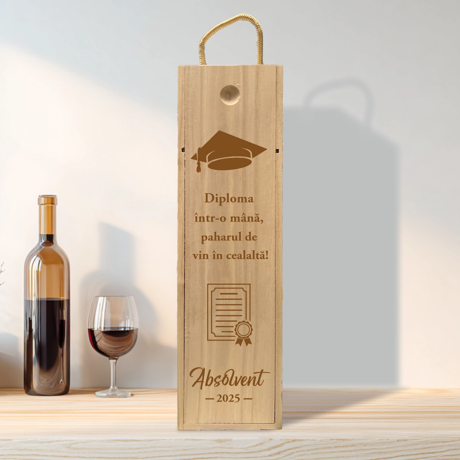 🍷 Cutie din lemn pentru sticlă de vin – Cadoul Perfect pentru Absolvire 🍷
