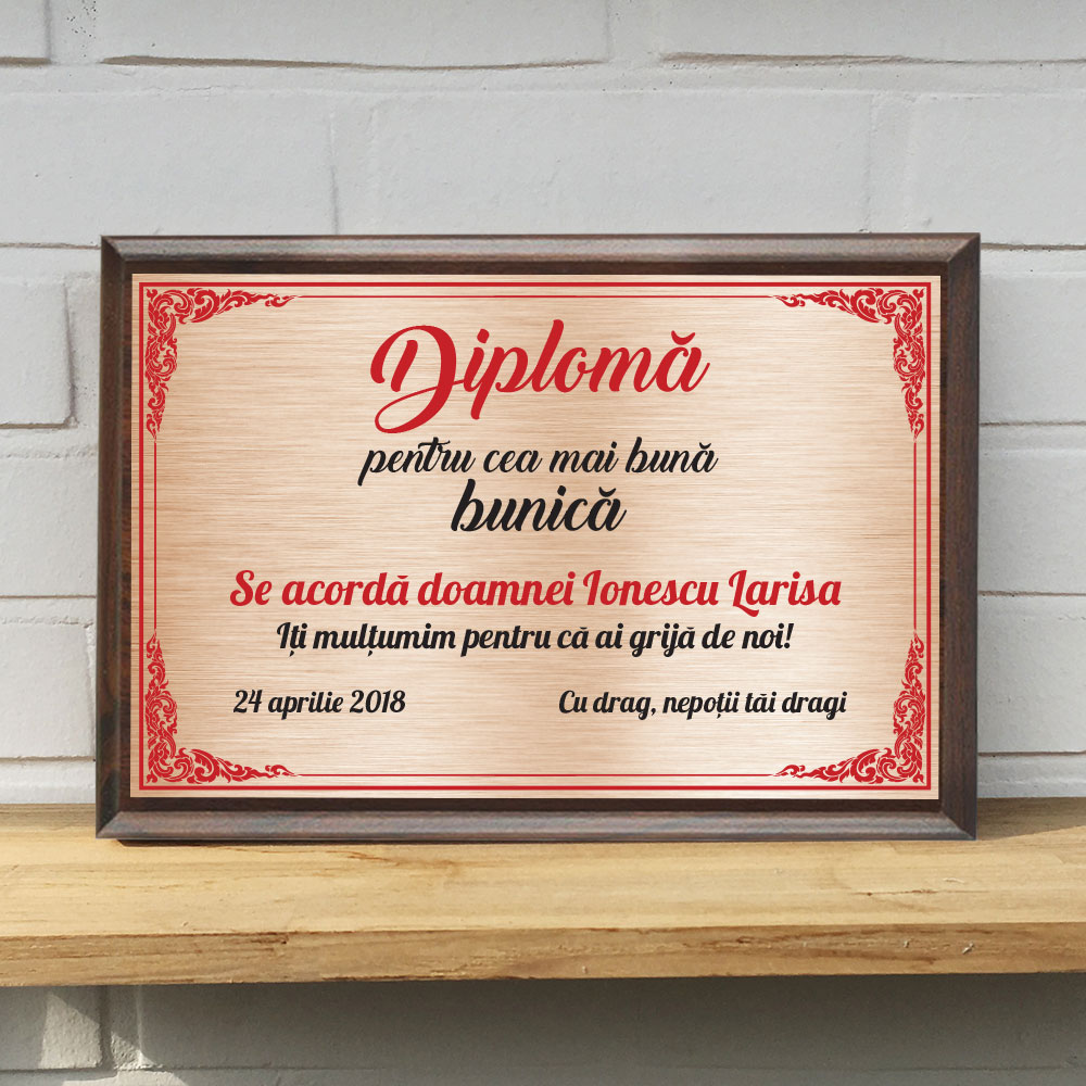 Diplomă personalizabilă gravată, cu plachetă din lemn, Cea mai bună bunica