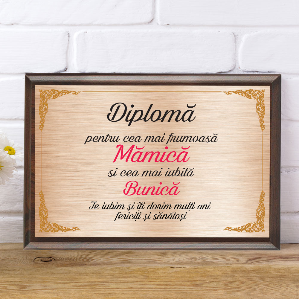 Diplomă personalizabilă gravată, cu plachetă din lemn, Cea mai frumoasă mămică și cea mai iubită bunică