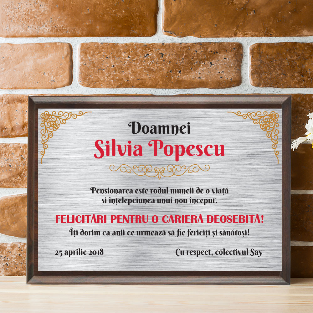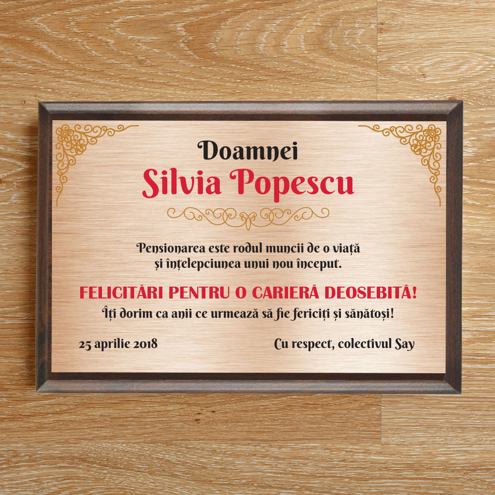 Diplomă personalizabilă gravată, cu plachetă din lemn, Diplomă Pensionare