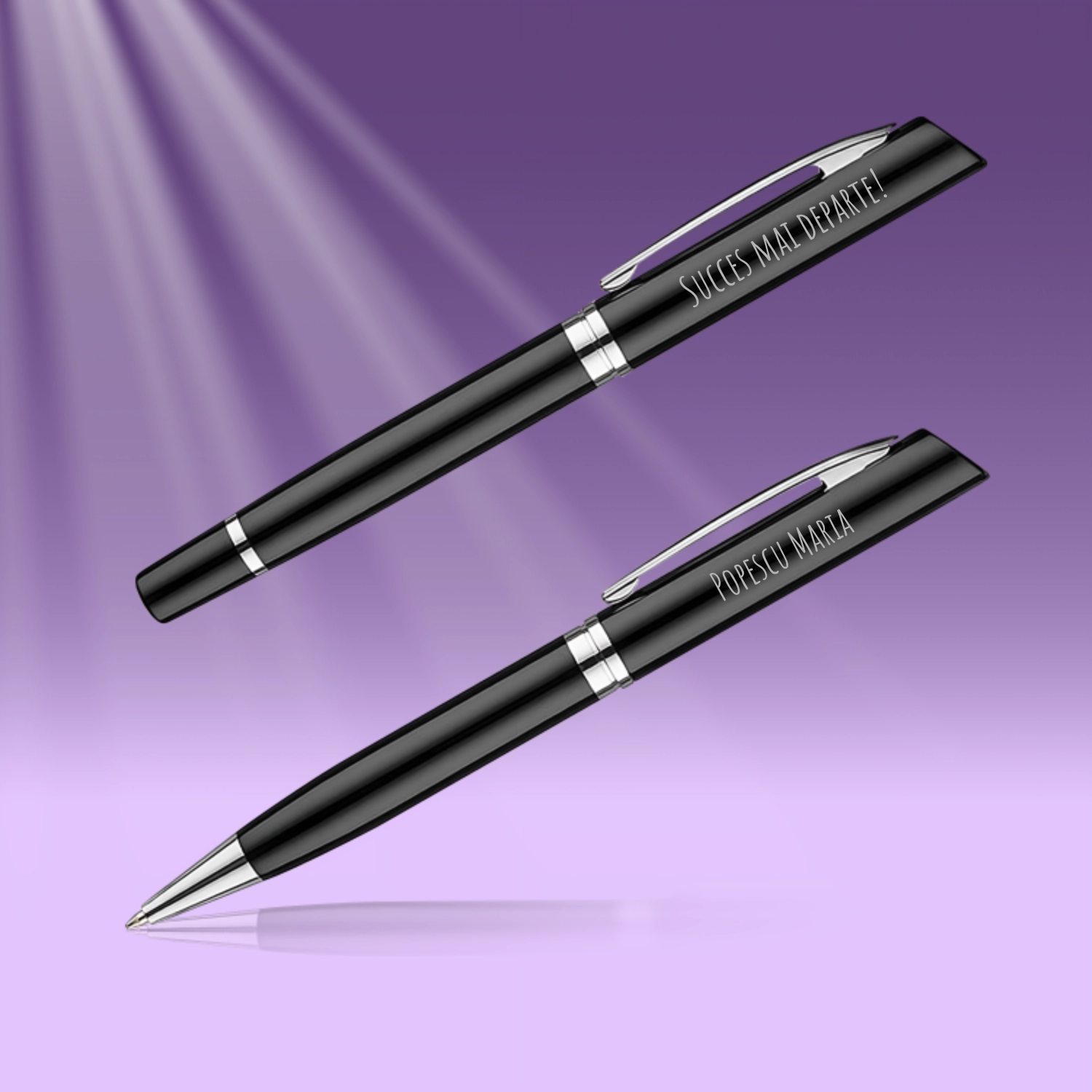 Un cadou rafinat și practic, ideal pentru a felicita un absolvent într-un mod elegant. Setul de două pixuri personalizate oferă un plus de stil și utilitate, fiind potrivit atât pentru uz zilnic, cât și pentru momente importante.
