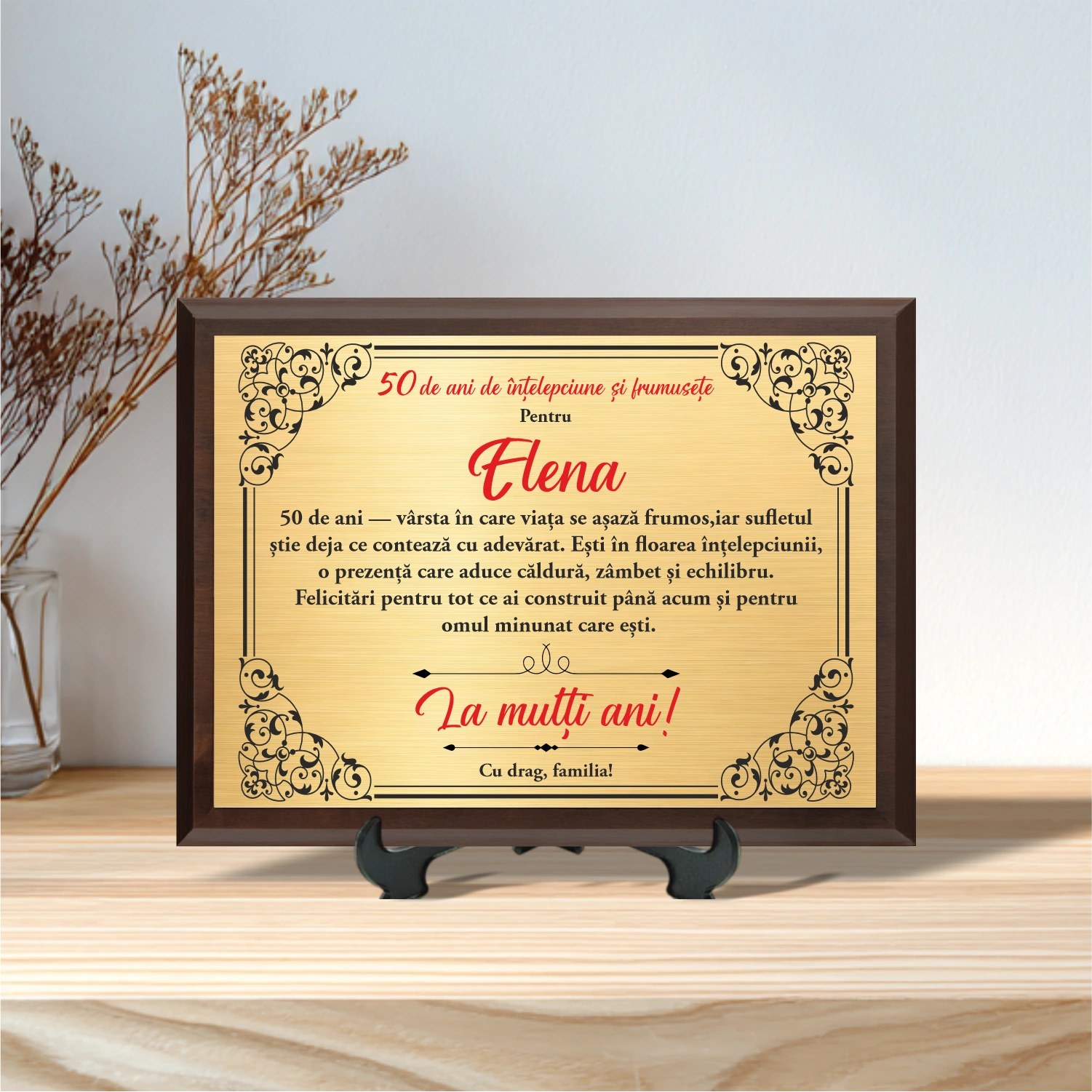Diplomă personalizabilă imprimată, cu plachetă din lemn, Aniversarea a 50 de ani împliniți [ #0016 ]